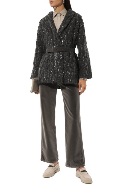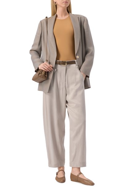 Свободные брюки с эластичным поясом и четырьмя карманами выполнили из бархата Sleek на основе хлопка с добавлением вискозы. Зону колен дополнили вставками с вытачками. Ширину брючин снизу можно регулировать боковыми ремешками с кнопками.