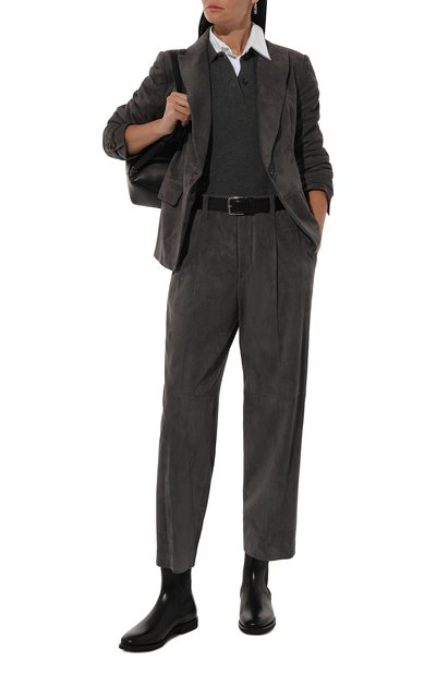Брюки с защипами спереди, переходящими в отглаженные стрелки, сшили из шерстяного твила с добавлением металлизированных нитей. Модель с четырьмя карманами дополнили регулируемыми патами на поясе по бокам.