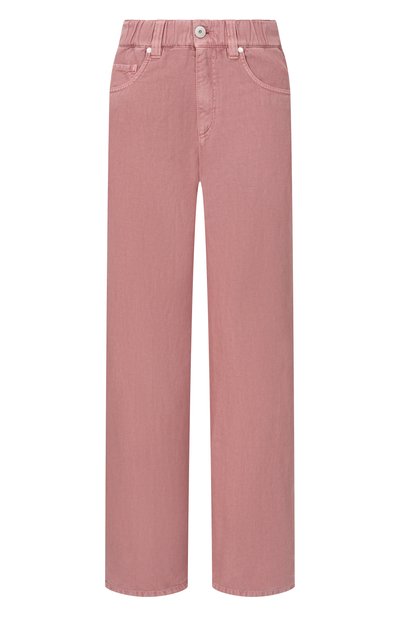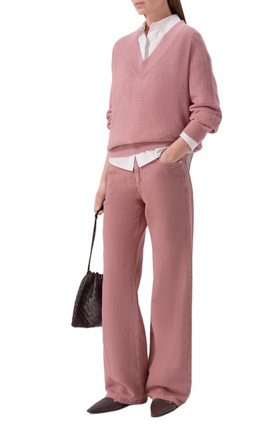 Широкие джинсы сшили из хлопка с добавлением эластана. Модель с четырьмя карманами дополнили защипами спереди и кантом из цепочек мониль на шлевке сзади.