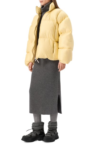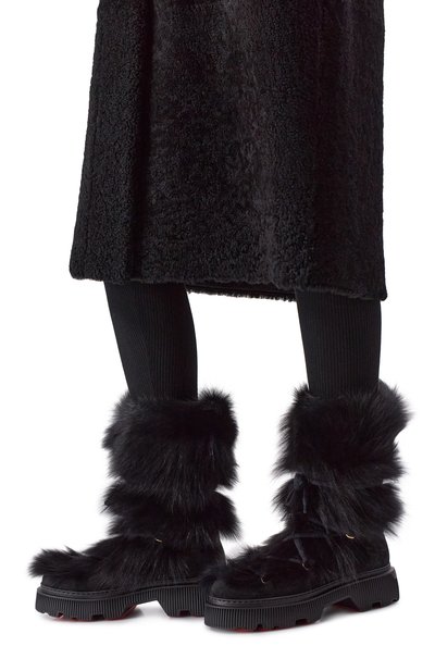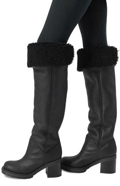 Высокие ботинки Mountain из телячьей замши утеплены овчиной. Волнистым мехом подчеркнули голенище, усиленную шнуровку и язычок с брендированным патчем. На заднике разместили петлю, украшенную фирменной цепочкой мониль. Пару поставили на широкую рифленую подошву, которая закрывает и мыс.