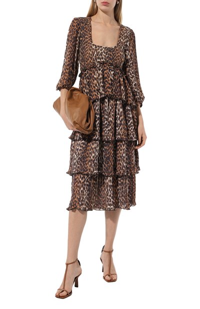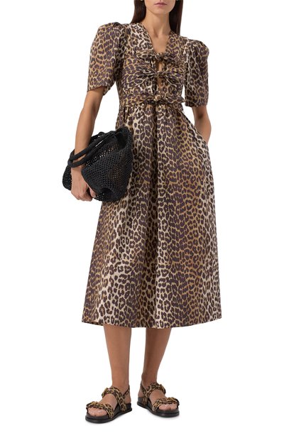 Мини-платье с завышенной линией талии и объемными короткими рукавами выполнили из сертифицированного органического хлопка с леопардовым принтом. Глубокий V-образный вырез спереди на лифе дополнили тремя парами завязок.
