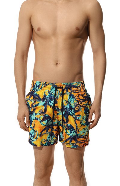 В принт с тропическими островами на плавках-шортах Monoi вписали изображения фирменной черепахи. О принадлежности бренду напоминает и патч на эластичном поясе-кулиске, под которым размещены люверсы. Модель из вторичного нейлона, продублированного сетчатым подкладом, дополнена боковыми карманами и задним с клапаном на застежке велкро.