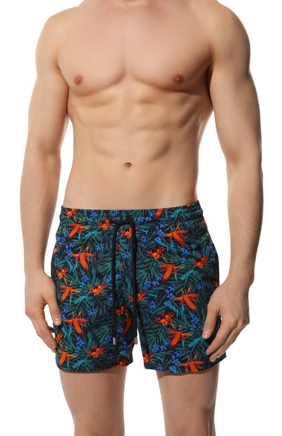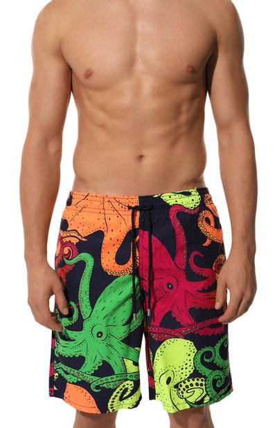 В принт с тропическими островами на плавках-шортах Monoi вписали изображения фирменной черепахи. О принадлежности бренду напоминает и патч на эластичном поясе-кулиске, под которым размещены люверсы. Модель из вторичного нейлона, продублированного сетчатым подкладом, дополнена боковыми карманами и задним с клапаном на застежке велкро.