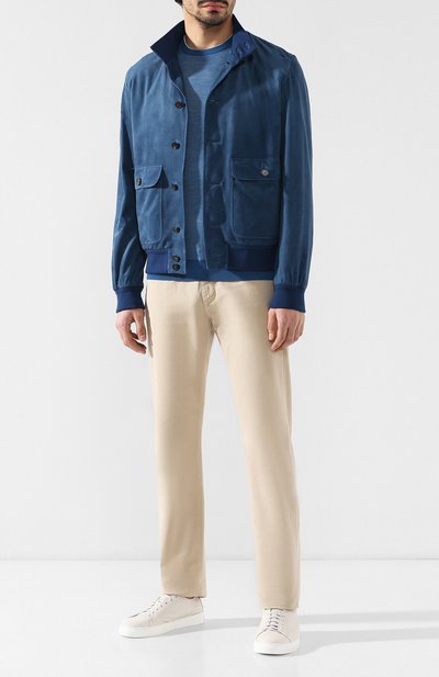 Бомбер Kant-KMU с рифлеными манжетами, поясом и воротником-стойкой с кнопками сшили из блестящей полиэстеровой тафты и замши из кожи ягненка. Модель с молнией, скрытой под планкой с пуговицами, дополнили накладными боковыми карманами с клапанами и двумя внутренними с молниями.