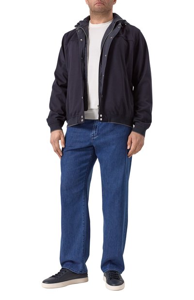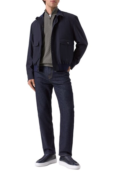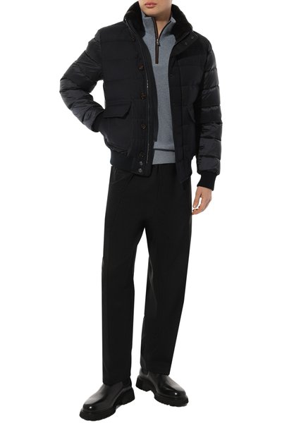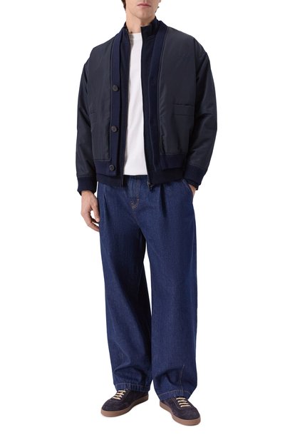 Перед текстильного бомбера Kant-KMU с манжетами, воротником-стойкой и поясом в рубчик выполнили из замши, подклад — из трикотажа. Модель с двумя внешними накладными и парой внутренних карманов застегивается молнией, скрытой штормовой планкой с пуговицами.