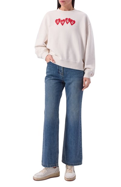 Свитшот со спущенной линией плеч сшили из хлопкового футера. Модель с рифлеными манжетами, низом и горловиной украсили ярким принтом и надписью Have a nice day!.