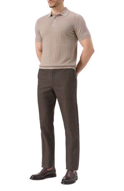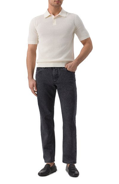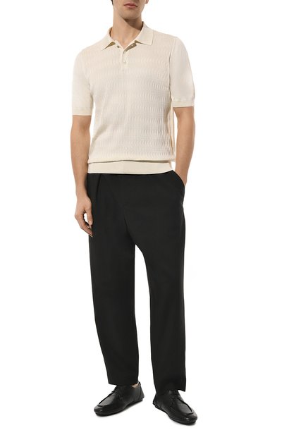 Для изготовления поло с эластичными манжетами и поясом использовали хлопковый трикотаж с вафельным узором. На плечах — вставки в тон воротнику.