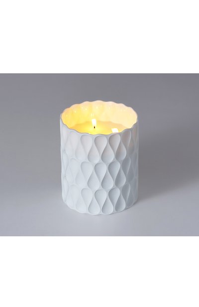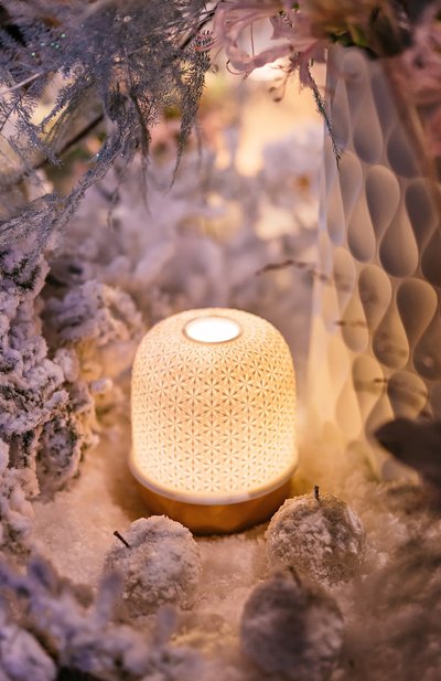 Когда внутри подсвечника зажигается светодиодная теплого белого цвета лампочка, фарфоровый литофан с рельефным орнаментом Badiane в виде звездочек аниса мягко рассеивает свет и создает уютную атмосферу. Воздушный купол противопоставлен черному матовому основанию из алюминия. Беспроводное изделие с тремя уровнями яркости работает от литий-ионной батареи, полный заряд которой обеспечит до 50 часов работы.
