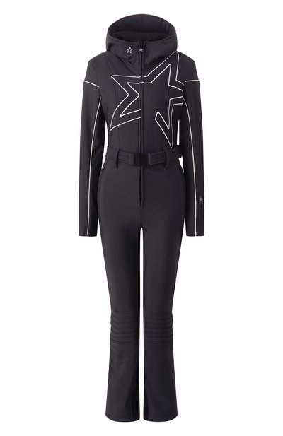 Комбинезон Star с контрастными эмблемами марки выполнили по технологии Toray Dermizax из эластичной водоотталкивающей ткани на основе нейлона. Для подкладки использовали флис. Изделие с ребристой отделкой на коленях дополнили парой карманов, капюшоном и съемным поясом. Брючины со снегозащитными гетрами застегиваются сзади молниями.