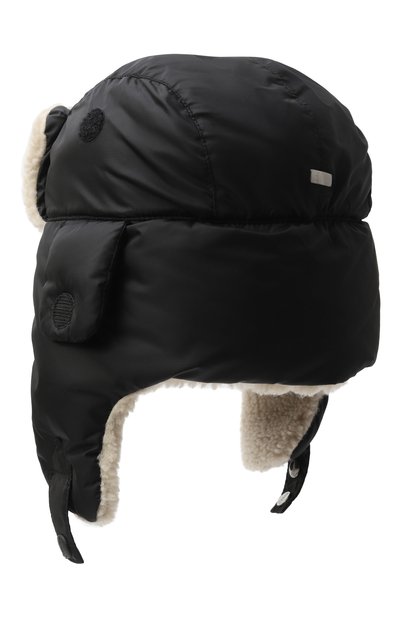 Шапку с декоративными ушками изготовили из мягкой стриженой овчины. Аксессуар с эластичной вставкой сзади фиксируется под подбородком длинными шнурами.