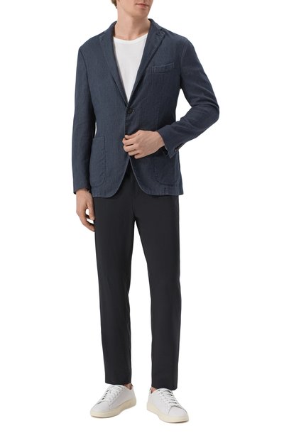 Однобортный пиджак из стрейчевого твила на основе льна с добавлением хлопка удачно впишется в повседневный образ с футболкой и джинсами. Немного выбеленную модель без подклада дополнили накладными нагрудным и боковыми карманами.