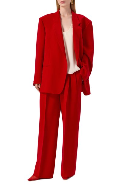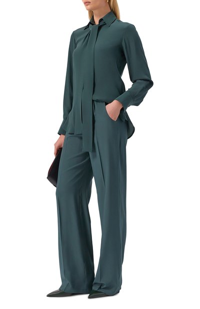 Расклешенные брюки со стрелками и высокой посадкой дополнили парой боковых и двумя прорезными ка рманами спереди. Модель из шерстяного крепа оттенка Nightfall green составит идеальный комплект с парным жакетом.