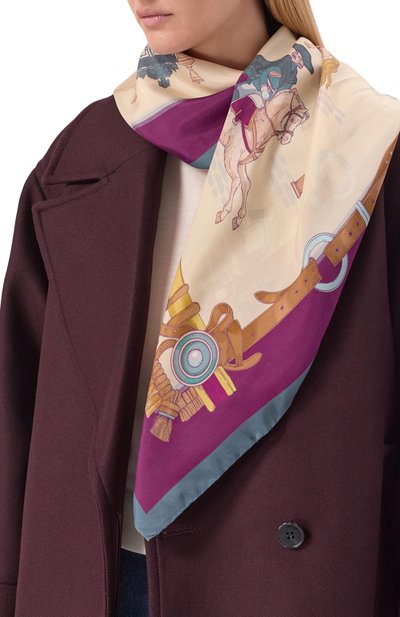 Квадратный полосатый платок сшили из ацетатного атласа, усиленного полиэстером. Аксессуар станет отличным дополнением базового гардероба.