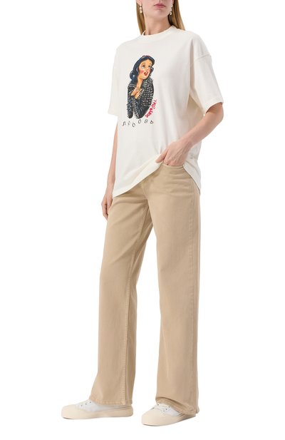 Джинсы с проглаженными стрелками и трикотажной лентой на кожаной нашивке сзади подружатся с вещами в разной цветовой гамме. Брюки из стрейчевого денима, окрашенные в готовом виде, дополнили боковыми, монетным и задними прорезными карманами.