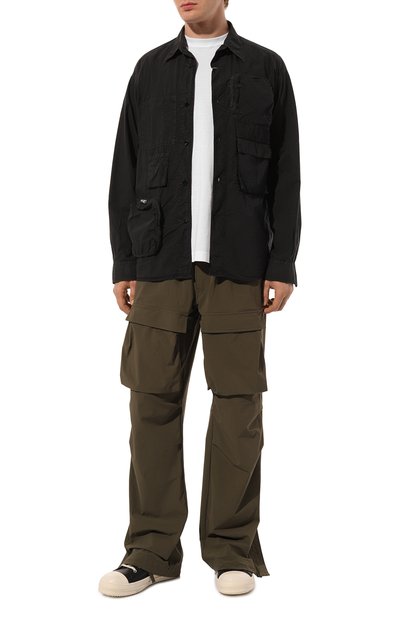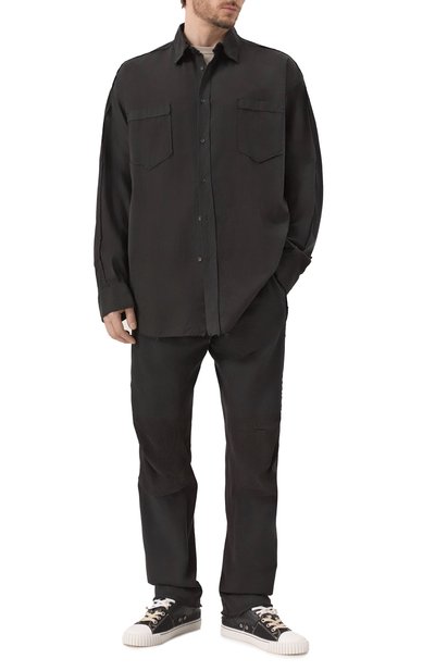 Рубашку с двумя нагрудными карманами сшили из гладкого нейлона с атласным блеском. Модель застегивается кнопками в тон. На принадлежность марке указывает белая строчка на спинке.