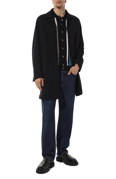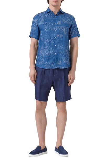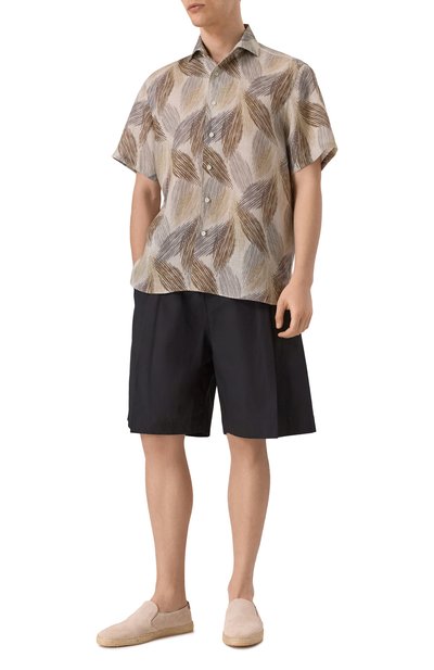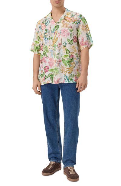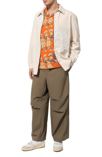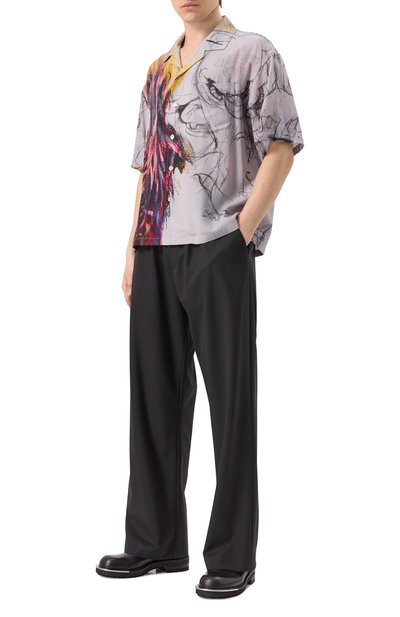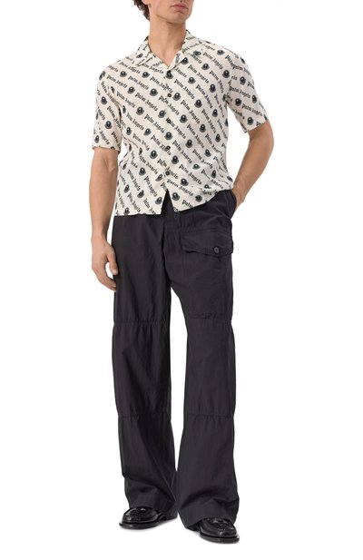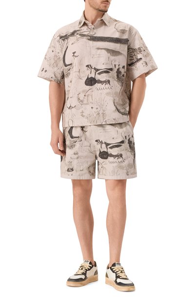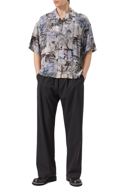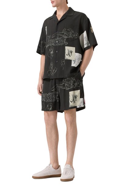 Рубашку с принтом, напоминающим карандашный рисунок, сшили из хлопка. Модель с супатной застежкой и небольшими разрезами по бокам украсили контрастным логотипом, вышитым под горловиной сзади.