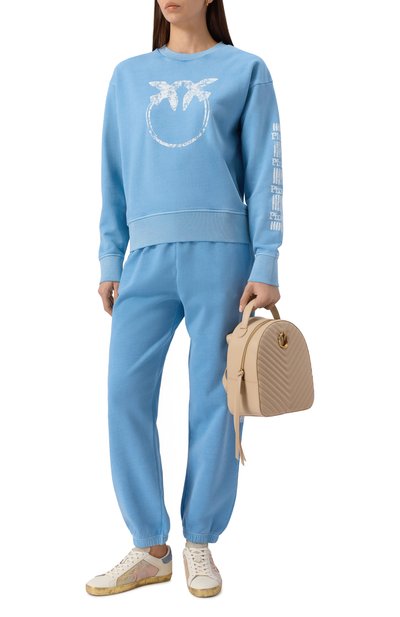 Свитшот со спущенной линией плеч, широкими манжетами и поясом выполнили из хлопкового футера. На груди разместили логотип бренда. Модель составит комфортный образ с парными джоггерами.
