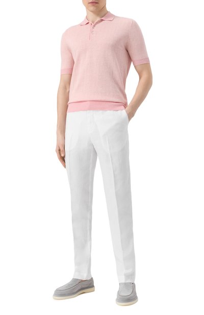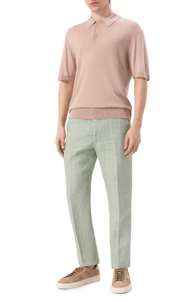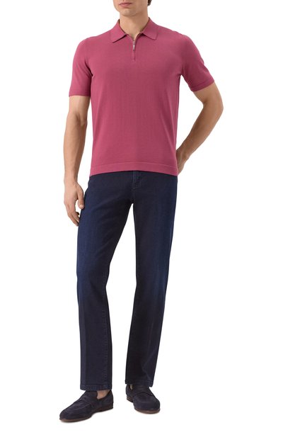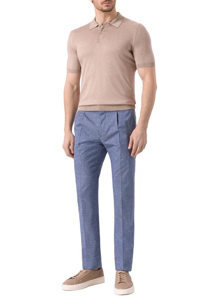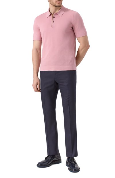 Для изготовления поло с V-образным вырезом и рифленой отделкой использовали хлопковый трикотаж с двухцветным микроузором. Модель легко подружится и с костюмными брюками, и с повседневными джинсами.
