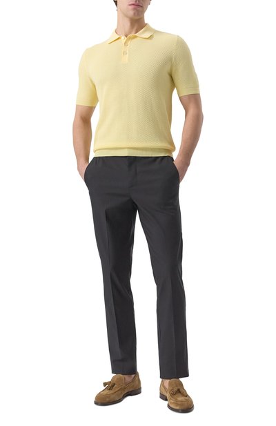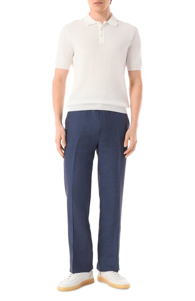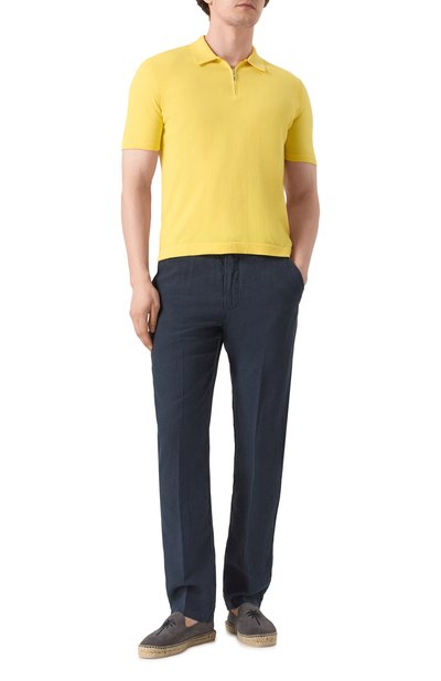 Поло с горловиной, манжетами и поясом в рубчик выполнили из двухцветного хлопкового трикотажа. Предлагаем создать непринужденный образ со слипонами и льняными брюками.