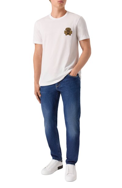 Хлопковая футболка вошла в коллекцию Italian Holiday. Модель украсили геральдической брендированной нашивкой, а рифленый кант на круглой горловине — фирменной биркой.