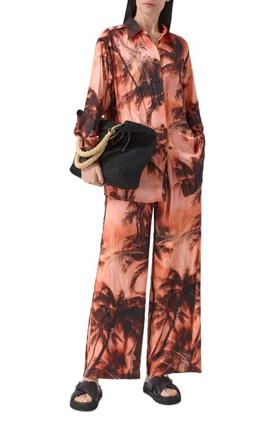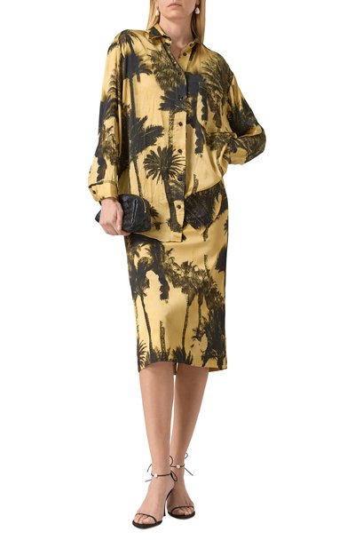 Юбку со шлицей сзади выполнили из полиэстера с принтом в виде пальм. Модель застегивается потайной молнией сбоку.