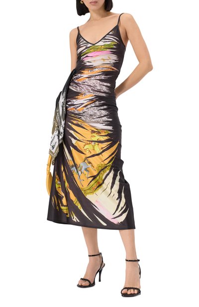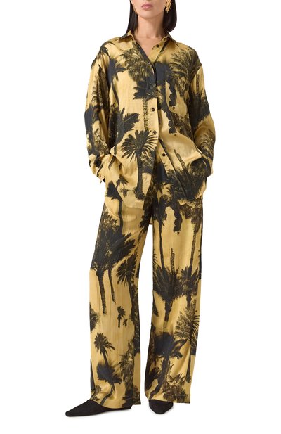 Юбку-карандаш с принтом в виде пальм сшили из полиэстера. Модель с высокой шлицей сзади и потайной молнией составит идеальный дуэт с парными рубашкой или жакетом.