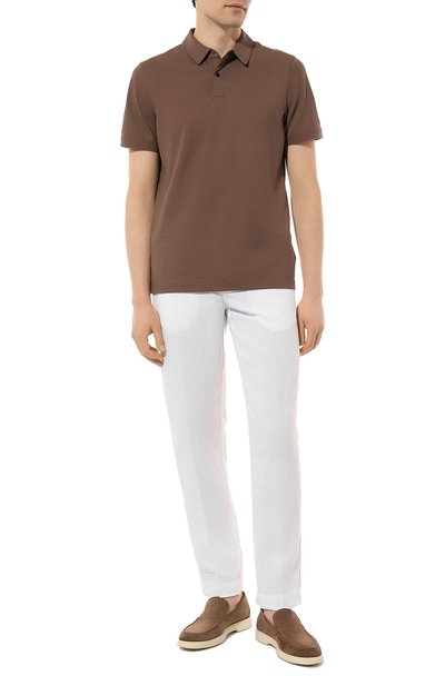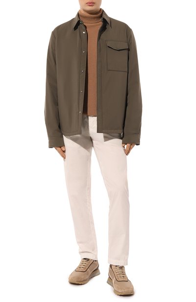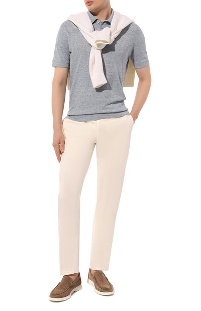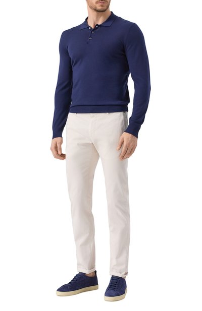 Брюки с фирменной нашивкой на поясе выполнили стрейчевого хлопка. Чиносы с проглаженными стрелками дополнили двумя боковыми и парой задних прорезных карманов, застегивающихся пуговицами.