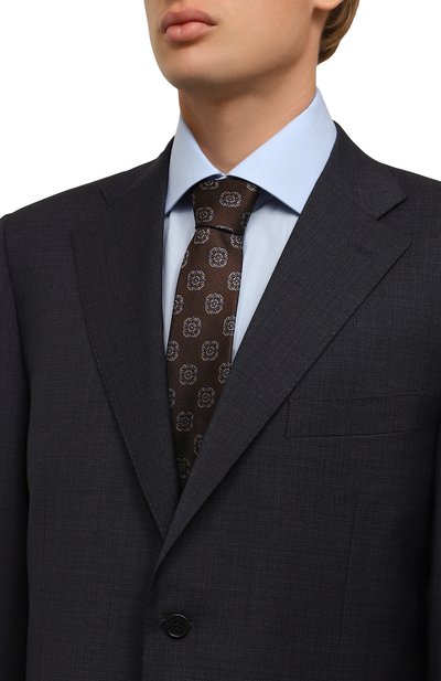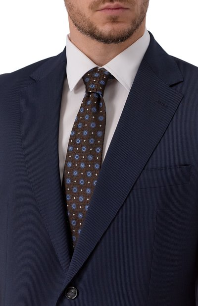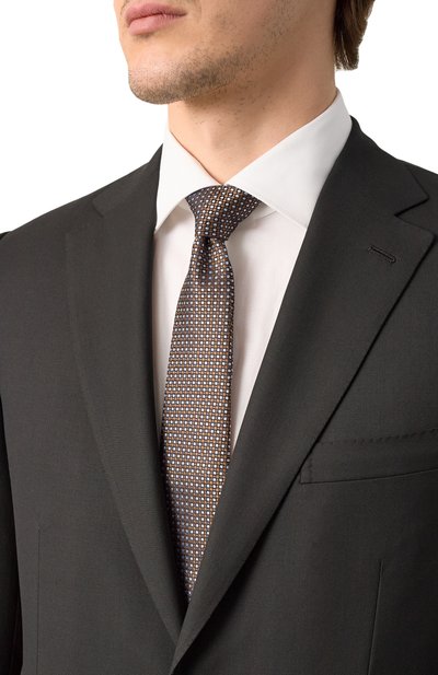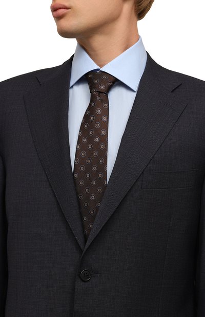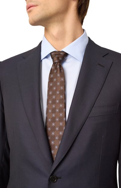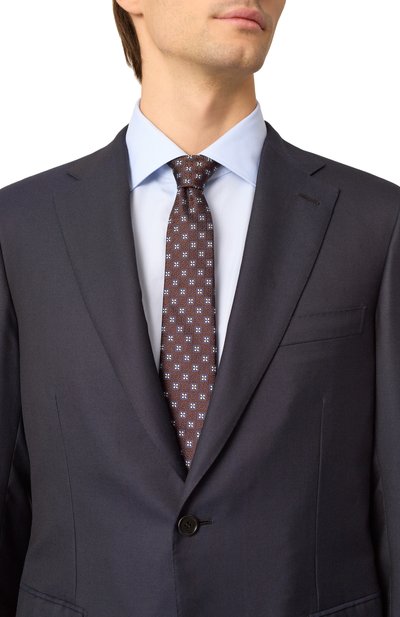 Галстук с геометрическим паттерном изготовили из шелкового жаккарда. Аксессуар классической ширины уплотнили текстильной подкладкой.