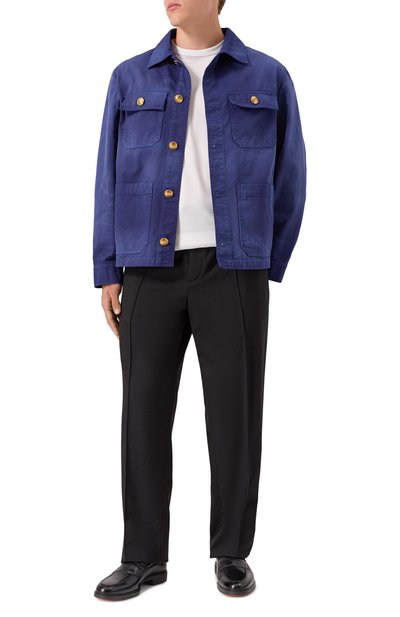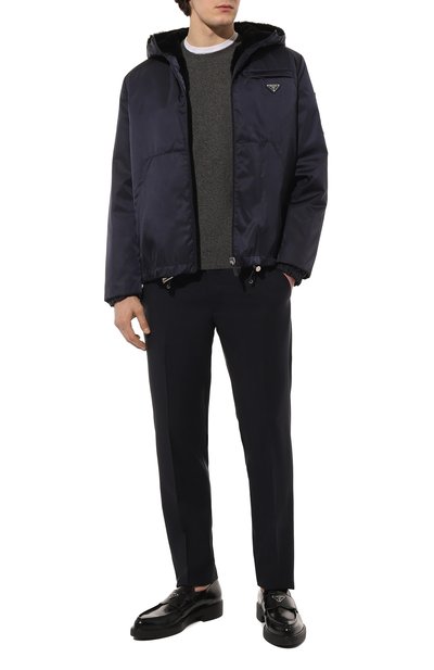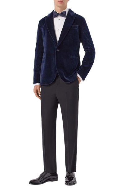 Для пошива модели с четырьмя карманами использовали шерстяную ткань grain de poudre. Изделие кроя Slim fit застегивается потайной молнией, пуговицей и крючком. Брюки со стрелками и атласными шелковыми лампасами органично поддержат вечерний образ со смокингом.