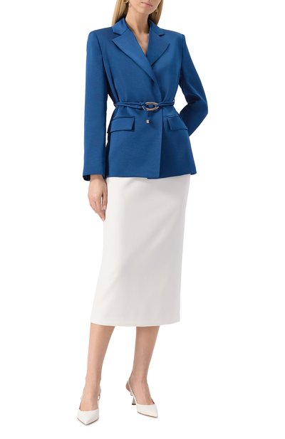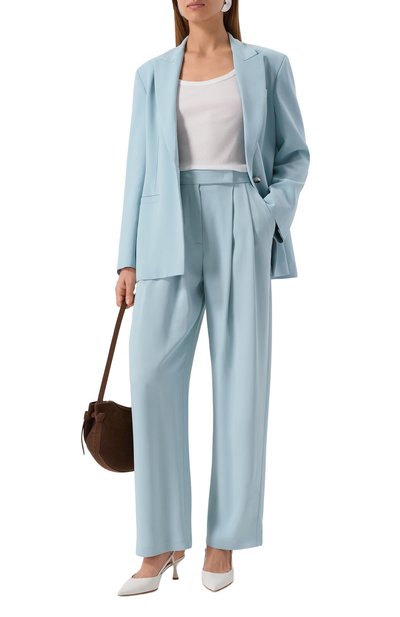 Однобортный жакет со шлицей и тремя внешними карманами сшили из ткани на основе вискозы и ацетата. Принадлежность бренду обозначили п атчем на левом рукаве.