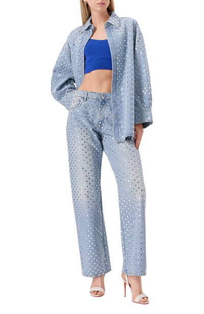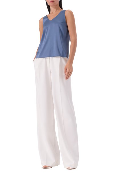 Топ с фирменными пряжками на бретелях составит яркий аутфит с парными брюками. Для пошива модели с V-образными вырезами использовали крепдешин из ацетата и шелка.