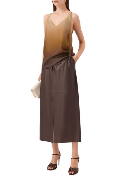 Топ с фирменными пряжками на бретелях составит яркий аутфит с парными брюками. Для пошива модели с V-образными вырезами использовали крепдешин из ацетата и шелка.