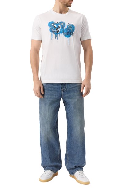 Футболка с принтами на груди и рукаве впишется в повседневные образы любой цветовой палитры. Модель кроя regular fit сшита из хлопкового джерси.