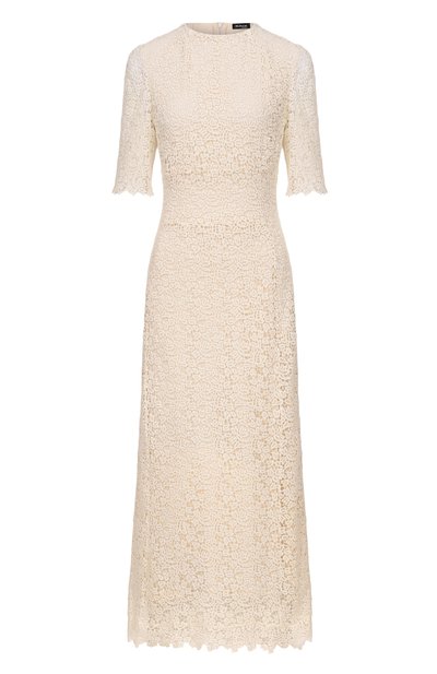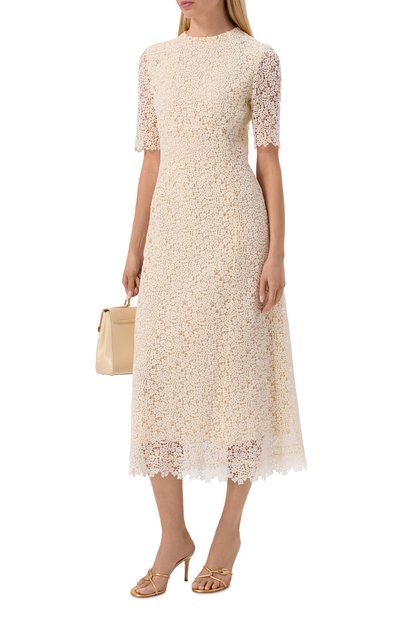 Платье Acacia из рами украсили цветочной вышивкой и рифмующимися с ней кружевными лентами и оборками с фестончатыми краями. Модель с потайной молнией сзади дополнили нижним платьем и плетеным поясом с металлическими эглетами.
