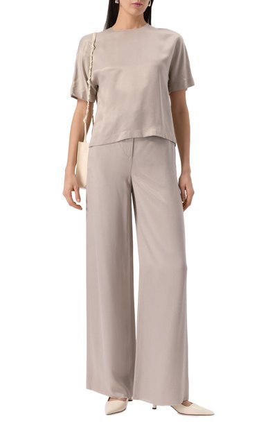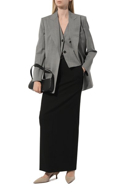 Зауженный мыс замшевых туфель подчеркнули гладкой кожей. Из такого же материала выполнили ремешок с эластичной вставкой, охватывающий открытую пятку. Пару поставили на высокий каблук.