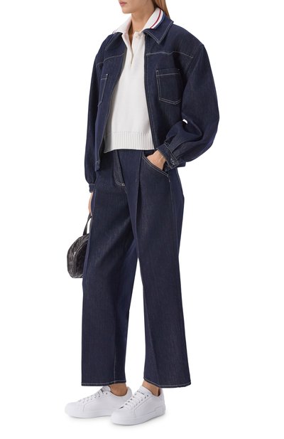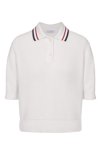 Геометрический узор на пуловере из хлопка составили из повторяющейся фирменной буквы K. Принадлежность марке подчеркнули и брендированной пластиной снизу. Воротник-поло, манжеты и пояс украсили тонкими полосами.