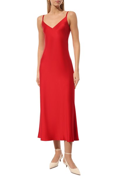 Макси-платье Gabrielle с драпировками на лифе сшито из струящегося шелкового атласа. Модель с тонкими перекрещивающимися бретелями дополнена высоким разрезом с длинной золотистой цепочкой.