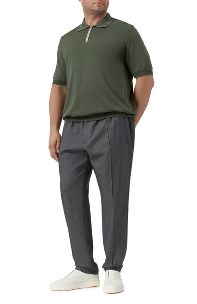 Хлопковое поло с рифленым узором по бокам и на плечах украсили контрастным кантом на воротнике и манжетах, а также вышитой монограммой SR на спинке. Модель застегивается короткой молнией с пуллером в виде фирменного октагона.