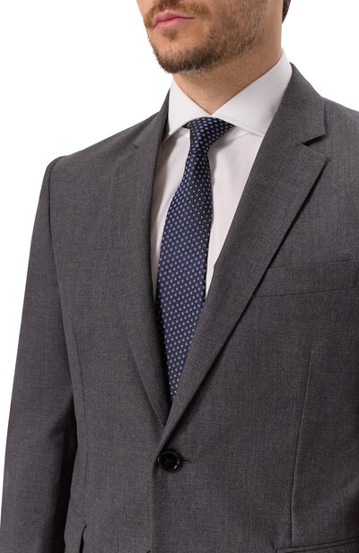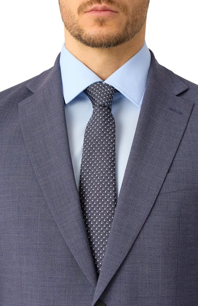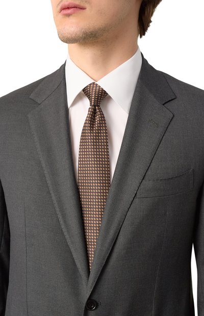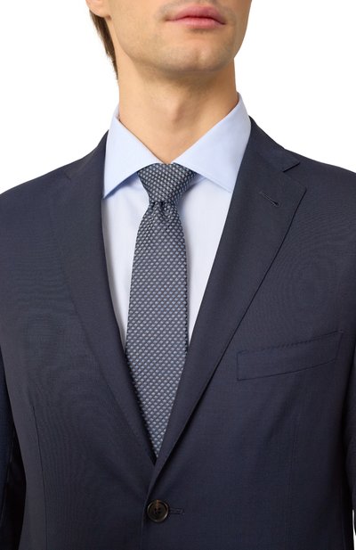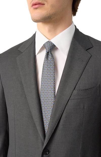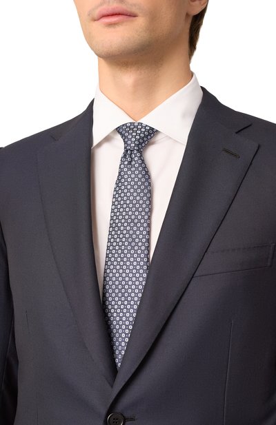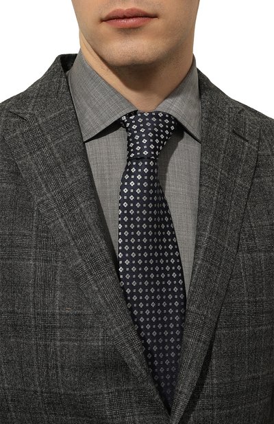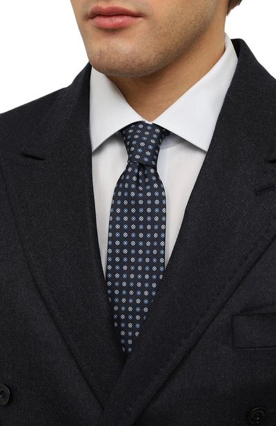 Для пошива галстука использовали матовый шелк с фуляровым геометрическим узором. Длины лаконичного аксессуара хватит, чтобы сформировать узел любой сложности.