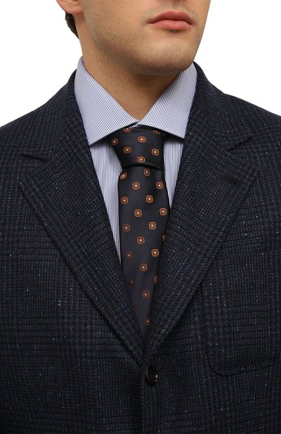 Галстук выполнили из шелкового жаккарда в широкую диагональную полосу. Широкий аксессуар отлично дополнит классический офисный гардероб.