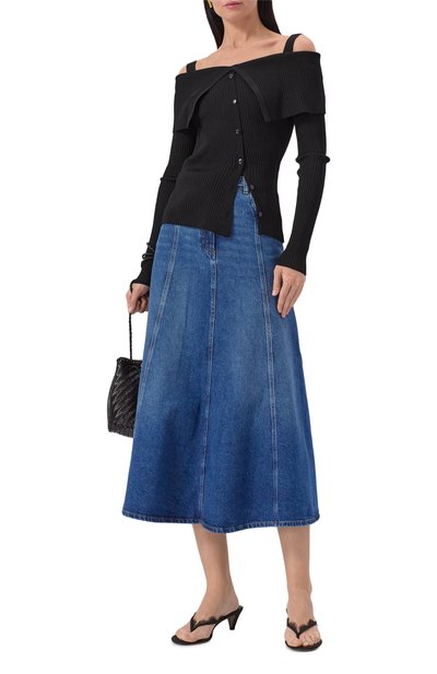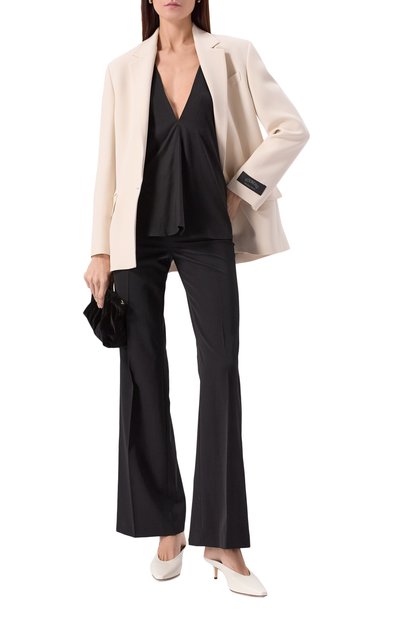 Топ с V-образным вырез ом, открытой спиной и узкими бретелями украсили расклешенной баской. Модель из ткани дюшес на основе переработанного нейлона дополнили вшитым регулируемым поясом с люверсами и эластичной вставкой сзади, подчеркивающим завышенную талию.