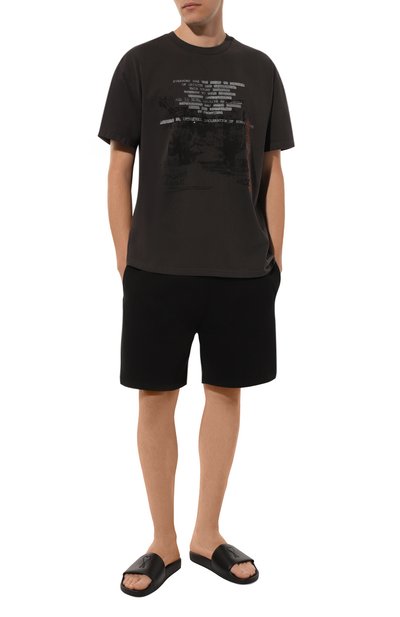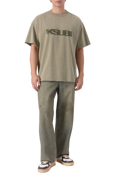 Футболку украсили логотипом на водной основе и абстрактными аппликациями спереди, а также нашивкой с флокированным принтом Diesel Core сзади. Модель со спущенной линией плеч сшили из органического хлопкового джерси.