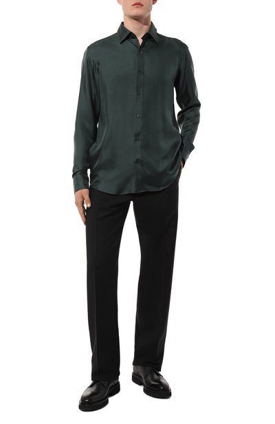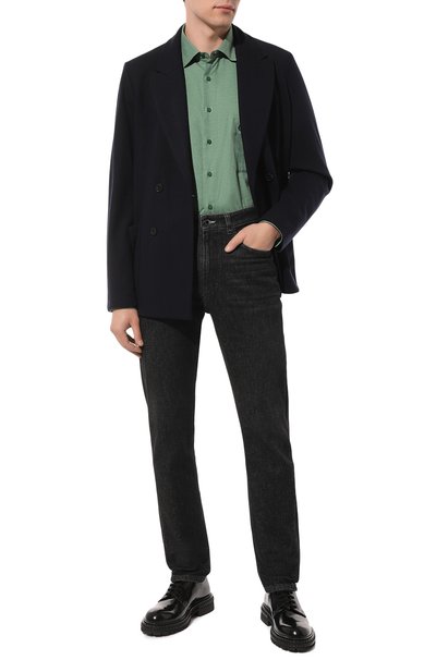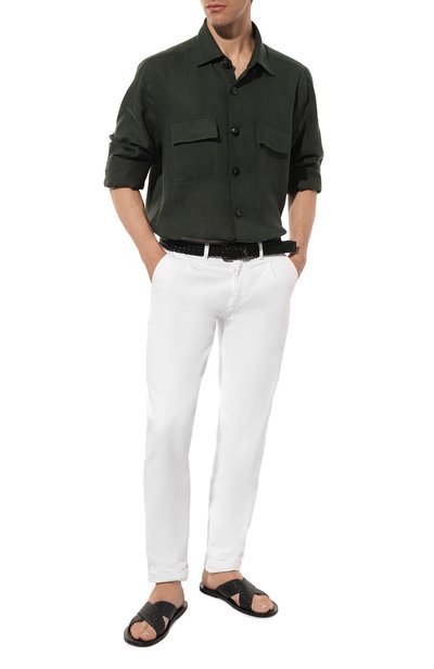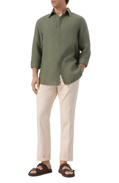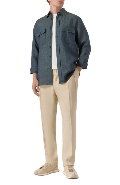 Рубашку с фигурным низом и закругленными манжетами дополнили нагрудными накладными карманами с клапанами. Модель из льняной ткани застегивается перламутровыми пуговицами.