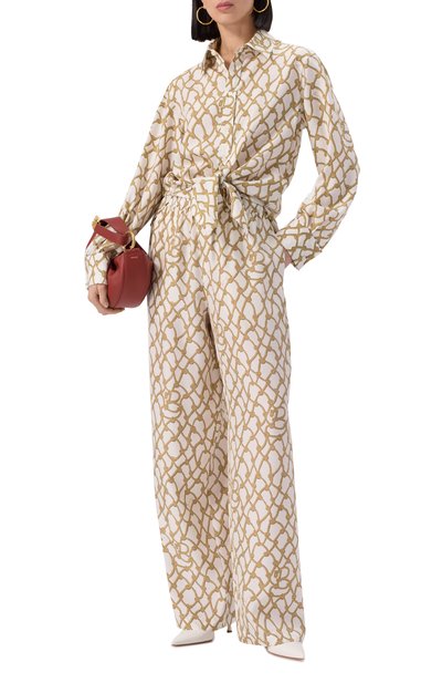 Рубашка из шелка заявляет о принадлежности бренду с помощью паттерна Toute la V. Узор повторяется на обтяжных пуговицах, которыми застегиваются само изделие и манжеты.