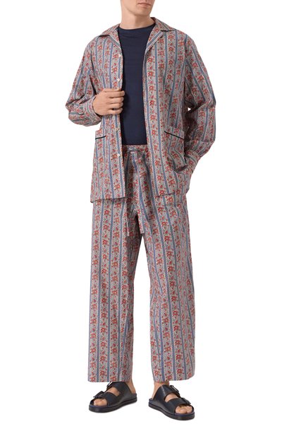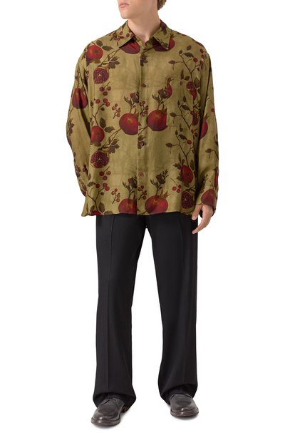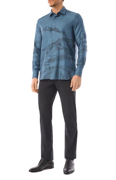 Рубашку с принтом в виде брендированных зажигалок сшили из шелкового твила. У модели из коллекции Italian Holiday предусмотрели небольшие разрезы сбоку. Воротник, планку с пуговицами и нагрудный карман отделали узким кантом.