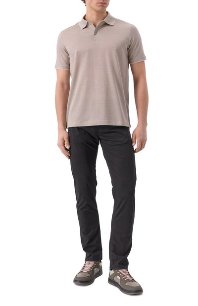 Поло с контрастным полосатым кантом на манжетах и отложном воротнике сшили из хлопкового пике. Спереди модель украсили вышитой эмблемой в виде фирм енной акулы.