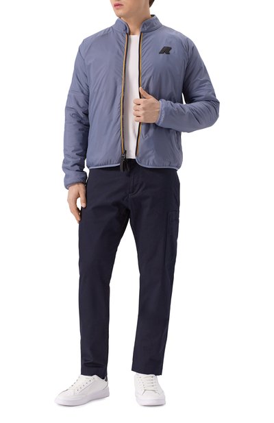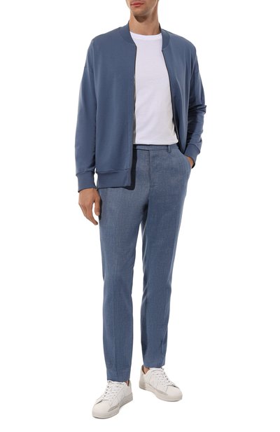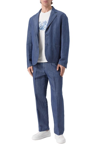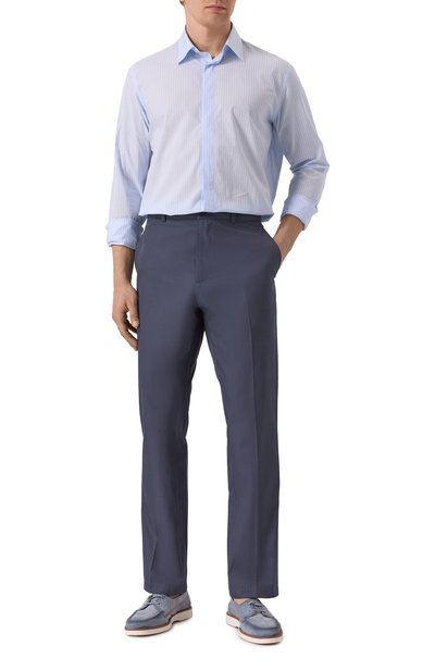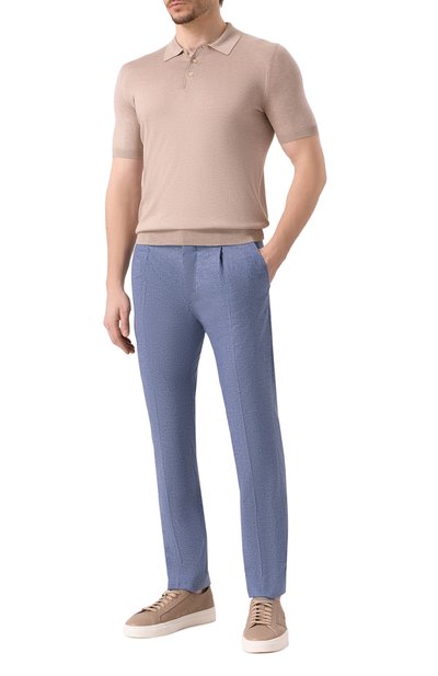 Брюки кроя Regular fit сшили из хлопковой ткани стрейч с добавлением шелка. Модель с четырьмя карманами дополнили съемным брелоком с подвеской в форме фирменной акулы.
