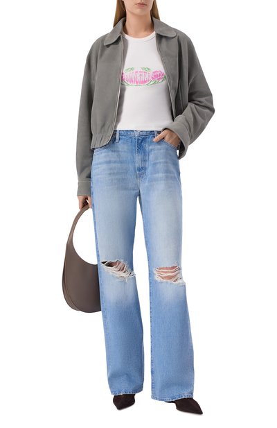 Топ с глубокими проймами сшили из хлопкового трикотажа в рубчик. Спереди модель украсили крупным рельефным изображением цветка, вышитым разноцветными нитями.