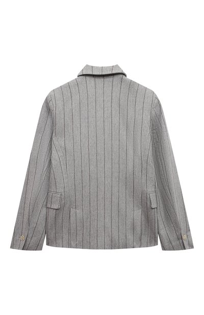 Двубортный пиджак с прямоугольными лацканами и двумя шлицами сзади дополнили тремя внешними карманами. Модель из текстурной меланжевой ткани на основе хлопка и льна застегивается роговыми пуговицами.