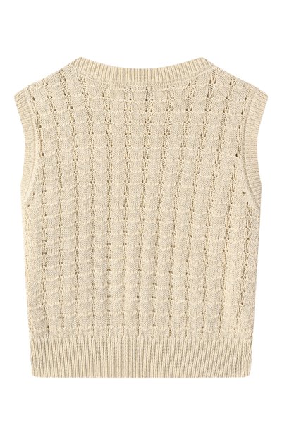 Жилет выполнили ажурной вязкой из хлопковой пряжи с добавлением полиамида и металлизированных нитей. Модель с отделкой в рубчик дополнили спереди фирменным брендированным патчем.
